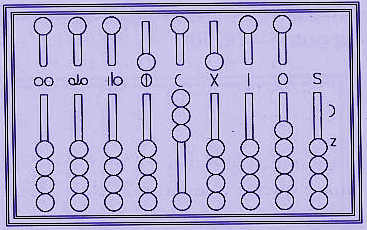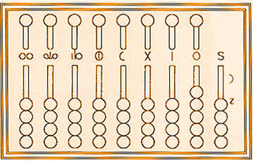 Ciascuna scannellatura rappresenta, cioè, un ordine di unità diviso per 5 (V) e per 4 (IIII) tanto da formare additivamente il numero romano VIIII (9). Ogni pallina delle righe inferiori vale 1 mentre la singola pallina superiore sta per il numero 5. Ad eccezione delle due prime righe a